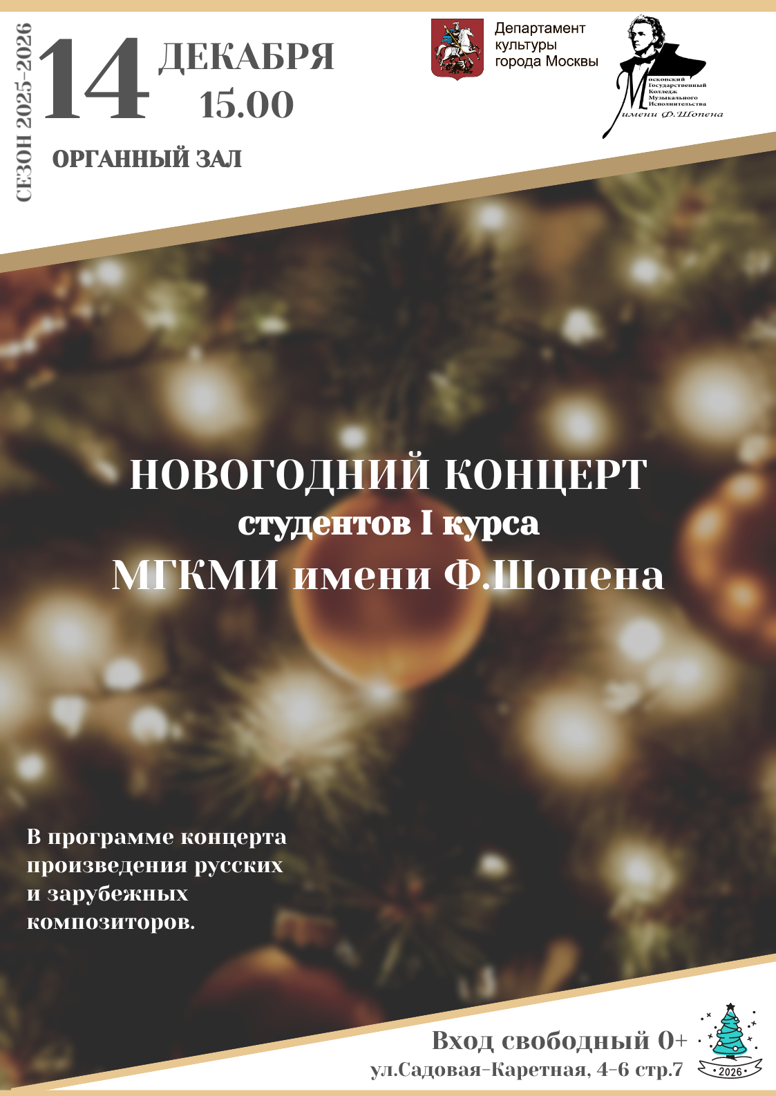 14.12 (воскресенье) 15.00 | Новогодний концерт студентов I курса Выступают студенты МГКМИ им.Ф. Шопена Органный зал МГКМИ им. Ф. Шопена