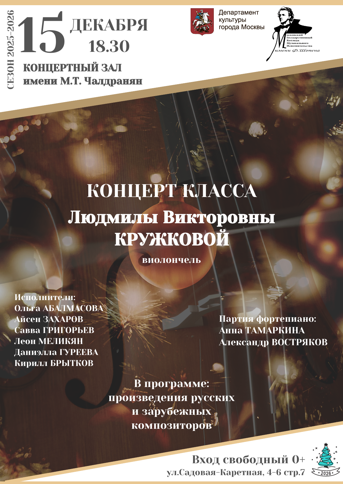 15.12 (понедельник) 18.30 | Классный вечер преподавателя по классу виолончели Л.В. Кружковой Классный концерт Концертный зал им. М.Т. Чалдранян