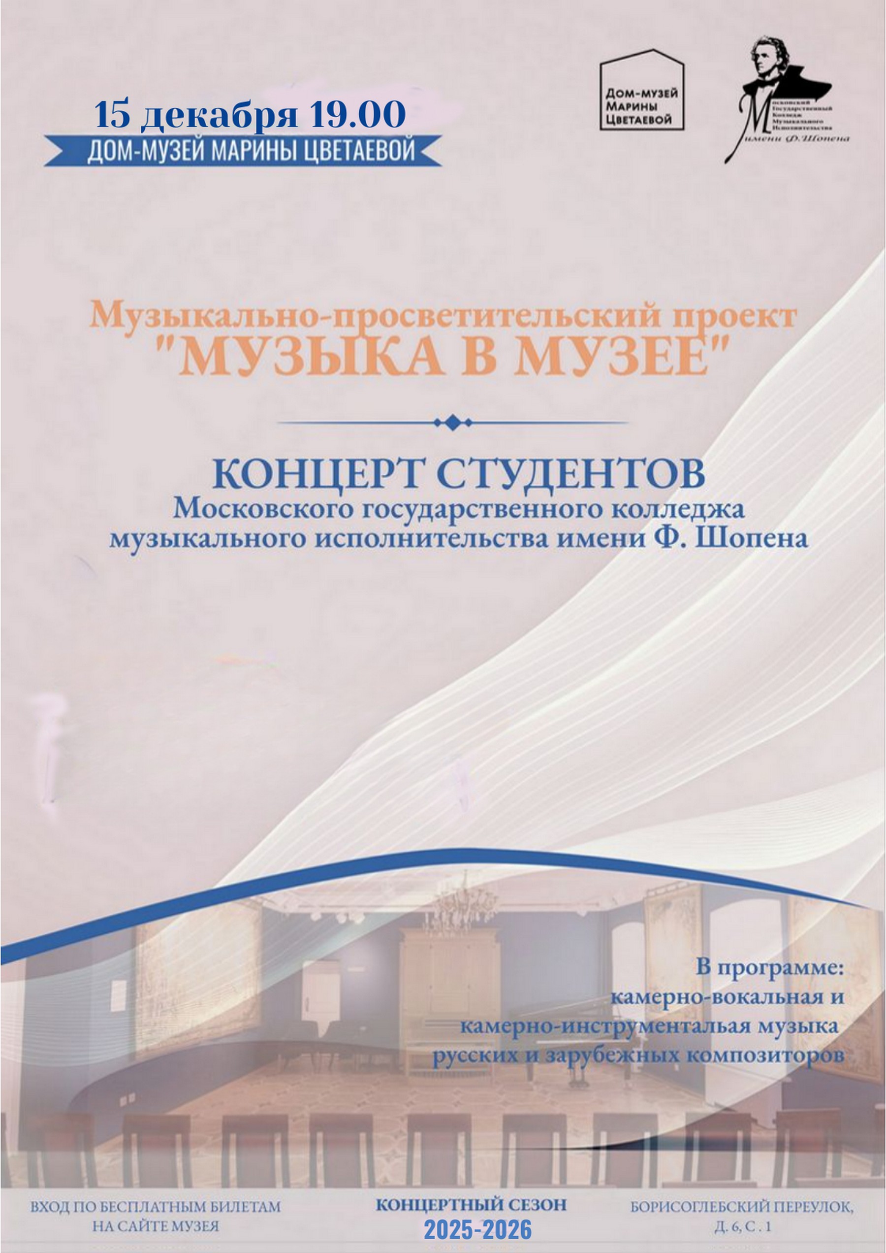 15.12 (понедельник) 19.00 | Концерт студентов в Доме-музее М.Цветаевой Концерт студентов МГКМИ им.Ф.Шопена