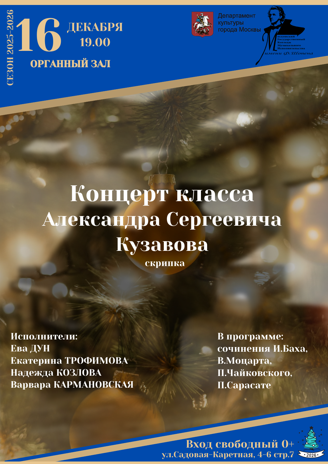 16.12 (вторник) 19.00 | Классный вечер преподавателя по классу скрипки А.С. Кузавова Классный концерт Органный зал МГКМИ им. Ф. Шопена