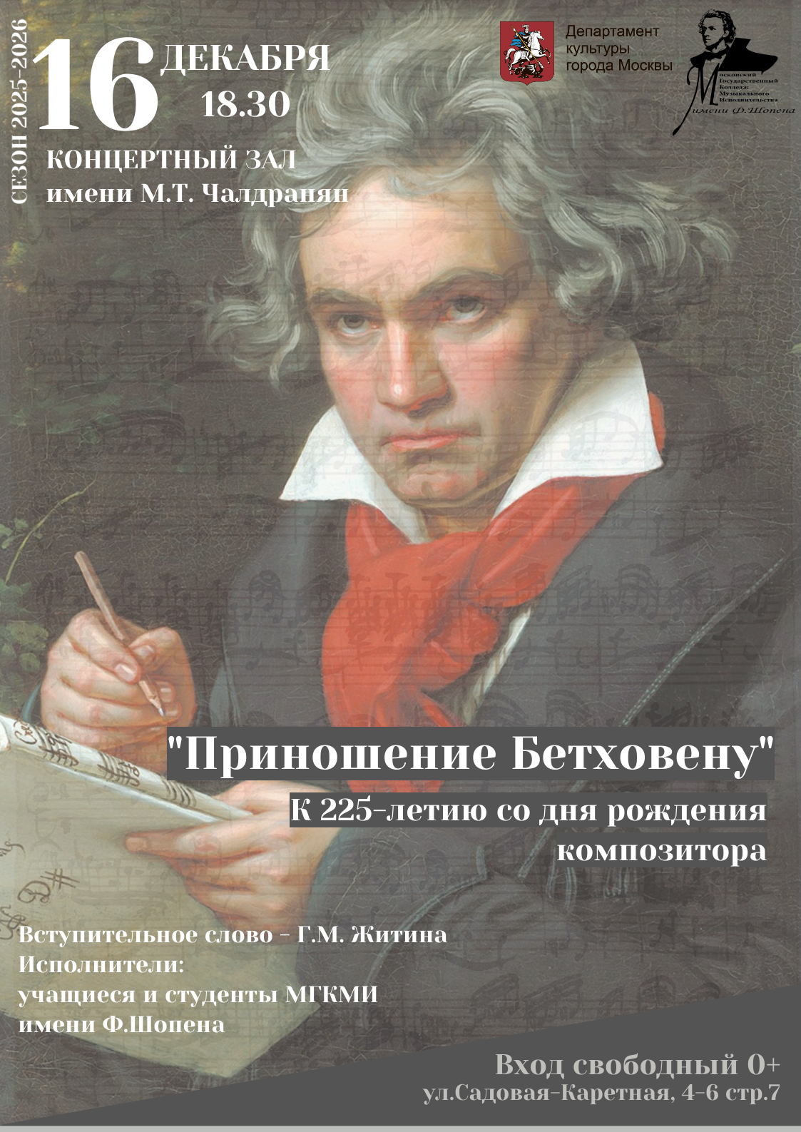 | 16.12 (вторник) 18.30 | Лекция-концерт "Приношение Бетховену" (к 225-летию со дня рождения Л.В. Бетховена) Выступают учащиеся ДМШ и студенты МГКМИ им.Ф. Шопена Концертный зал им. М.Т. Чалдранян