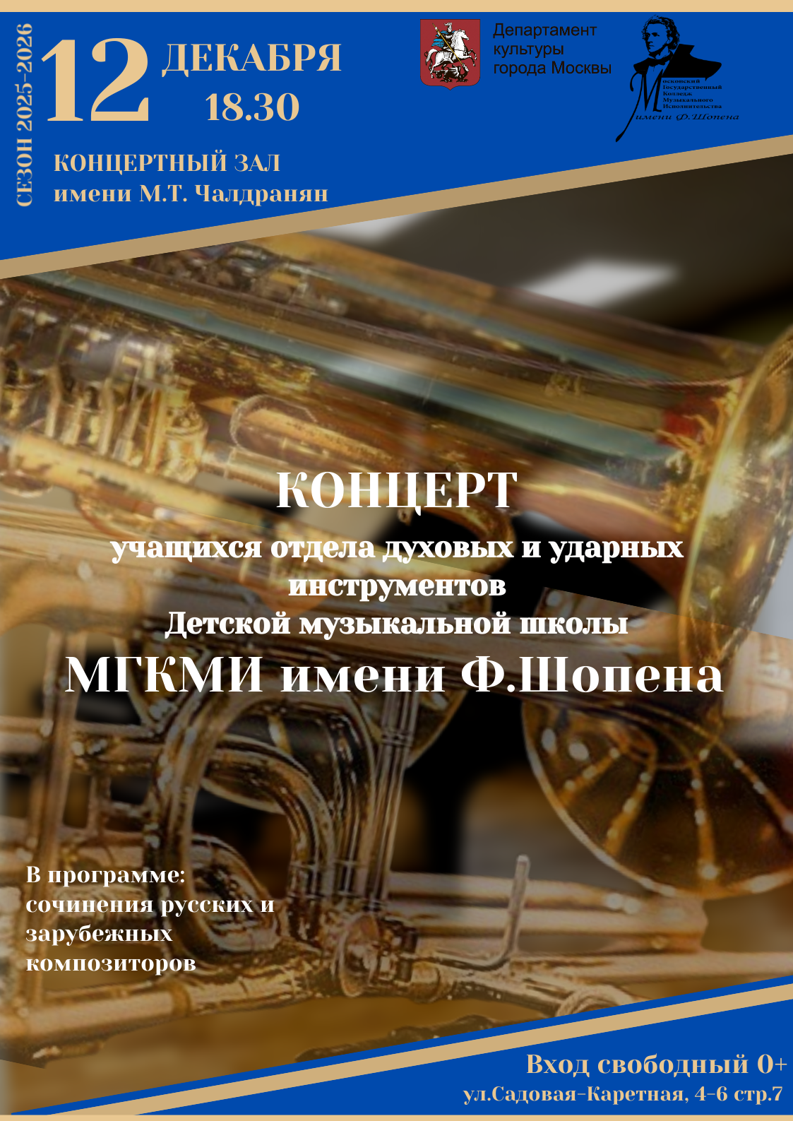 12.12 (пятница) 18.30 | Концерт учащихся отдела духовых и ударных инструментов ДМШ Выступают учащиеся ДМШ Концертный зал им. М.Т. Чалдранян