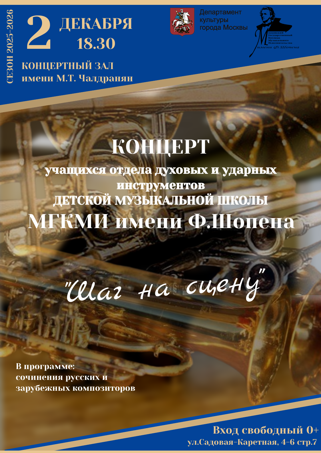 02.12 (вторник) 18.30 | Концерт учащихся отдела духовых и ударных инструментов ДМШ "Шаг на сцену" Выступают учащиеся ДМШ Концертный зал им. М.Т. Чалдранян