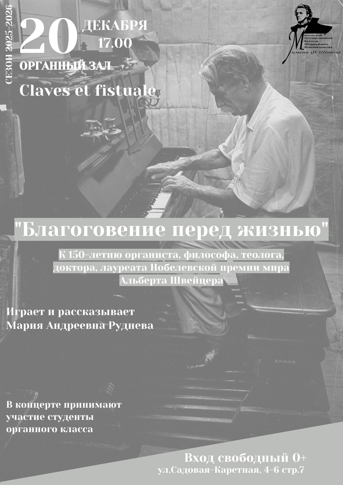 20.12 (суббота) 17.00 | "Благоговение перед жизнью" (к 150-летию органиста, философа, теолога, доктора, лауреата Нобелевской премии мира Альберта Швейцера Концерт из цикла "Сlaves et fistuale" Органный зал МГКМИ им. Ф. Шопена