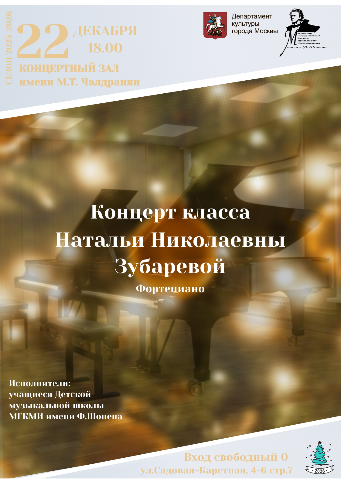 22.12 (понедельник) 18.00 | Классный вечер преподавателя по классу фортепиано Н.Н. Зубаревой Классный концерт Концертный зал им. М.Т. Чалдранян