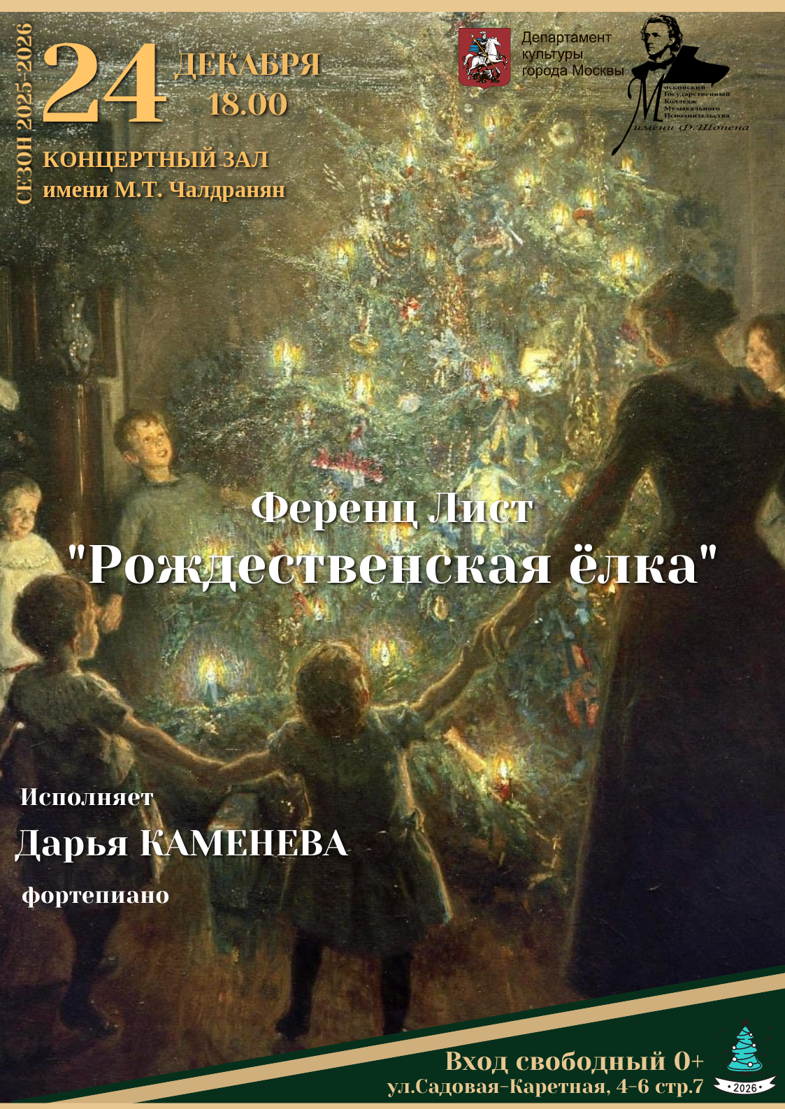 24.12 (среда) 18.30 | Концерт-лекция преподавателя Каменевой Д.М.: Ференц Лист "Рождественская ёлка" Концерт-лекция Концертный зал им. М.Т. Чалдранян