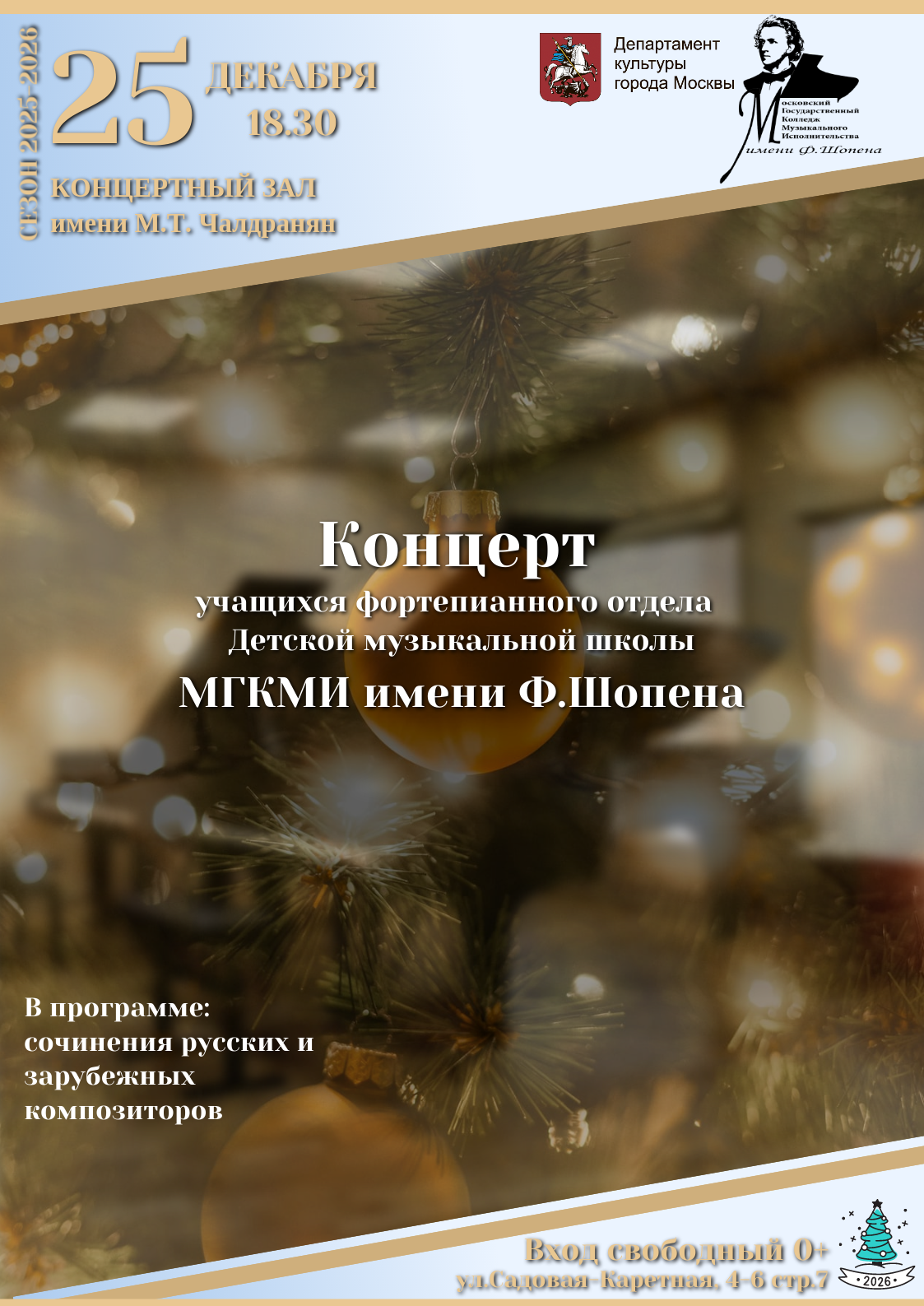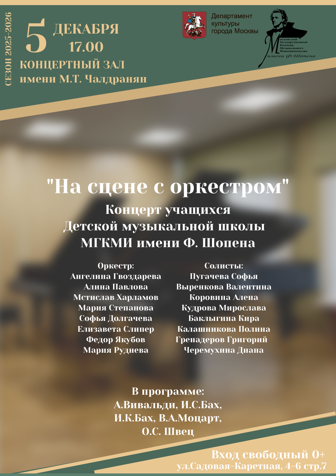 | 05.12 (пятница) 17.00 | Концерт учащихся ДМШ "На сцене с оркестром" Выступают учащиеся, студенты и преподаватели МГКМИ им. Ф. Шопена Концертный зал им. М.Т. Чалдранян