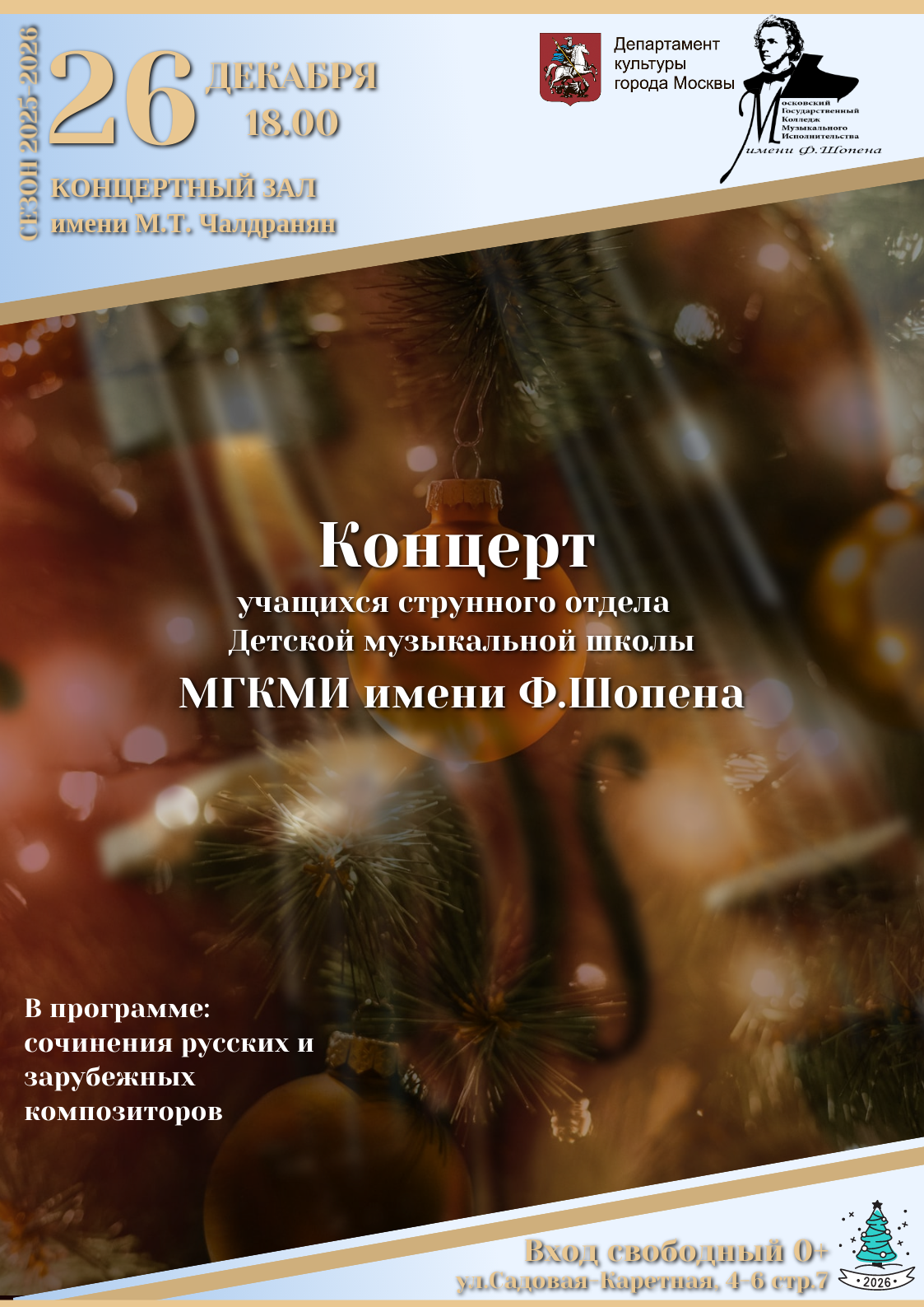26.12 (пятница) 18.30 | Новогодний концерт учащихся струнного отдела ДМШ Концерт учащихся ДМШ Концертный зал им. М.Т. Чалдранян
