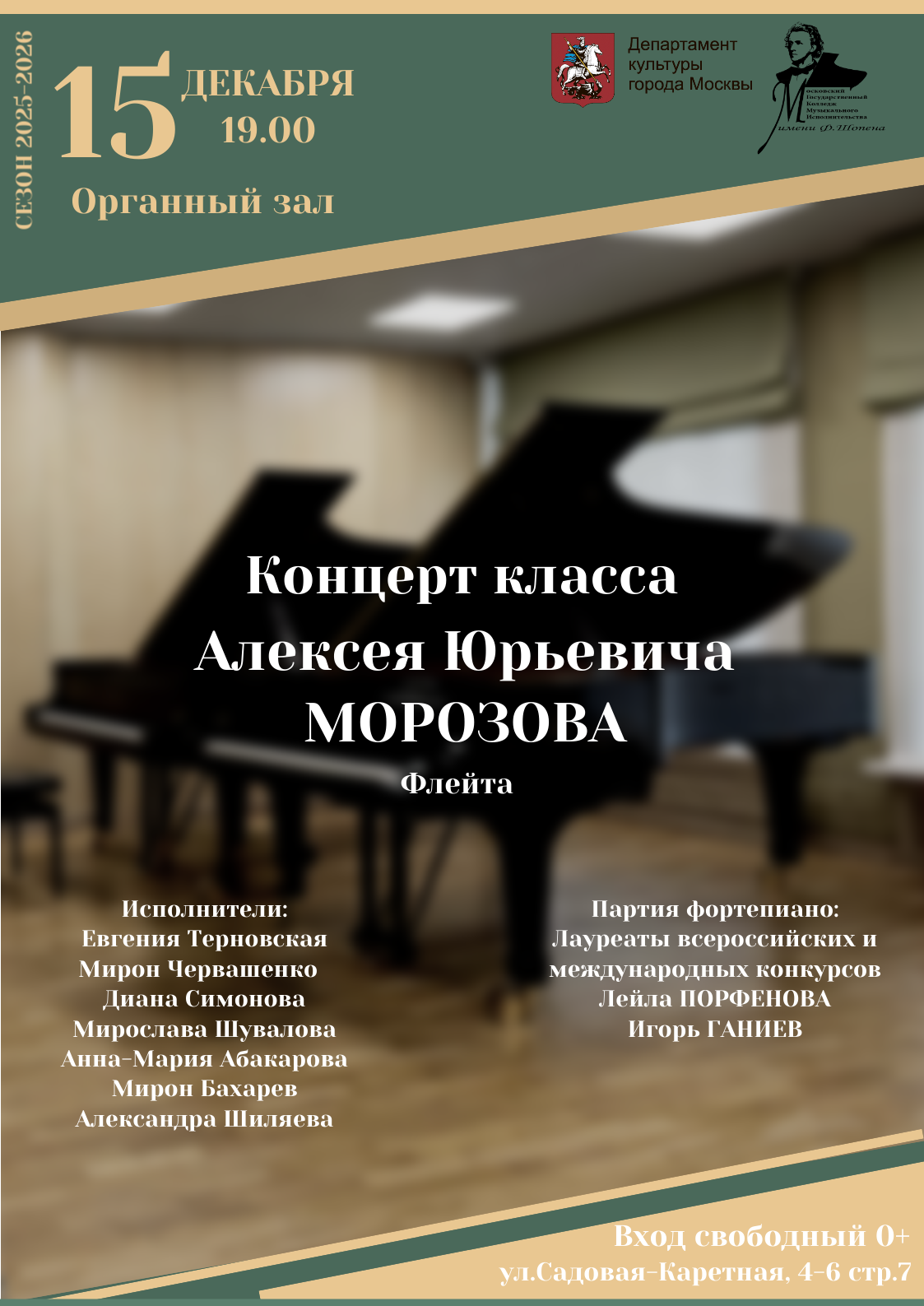 15.12 (понедельник) 19.00 | Классный вечер преподавателя по классу флейты А.Ю. Морозова Классный концерт Органный зал МГКМИ им. Ф. Шопена