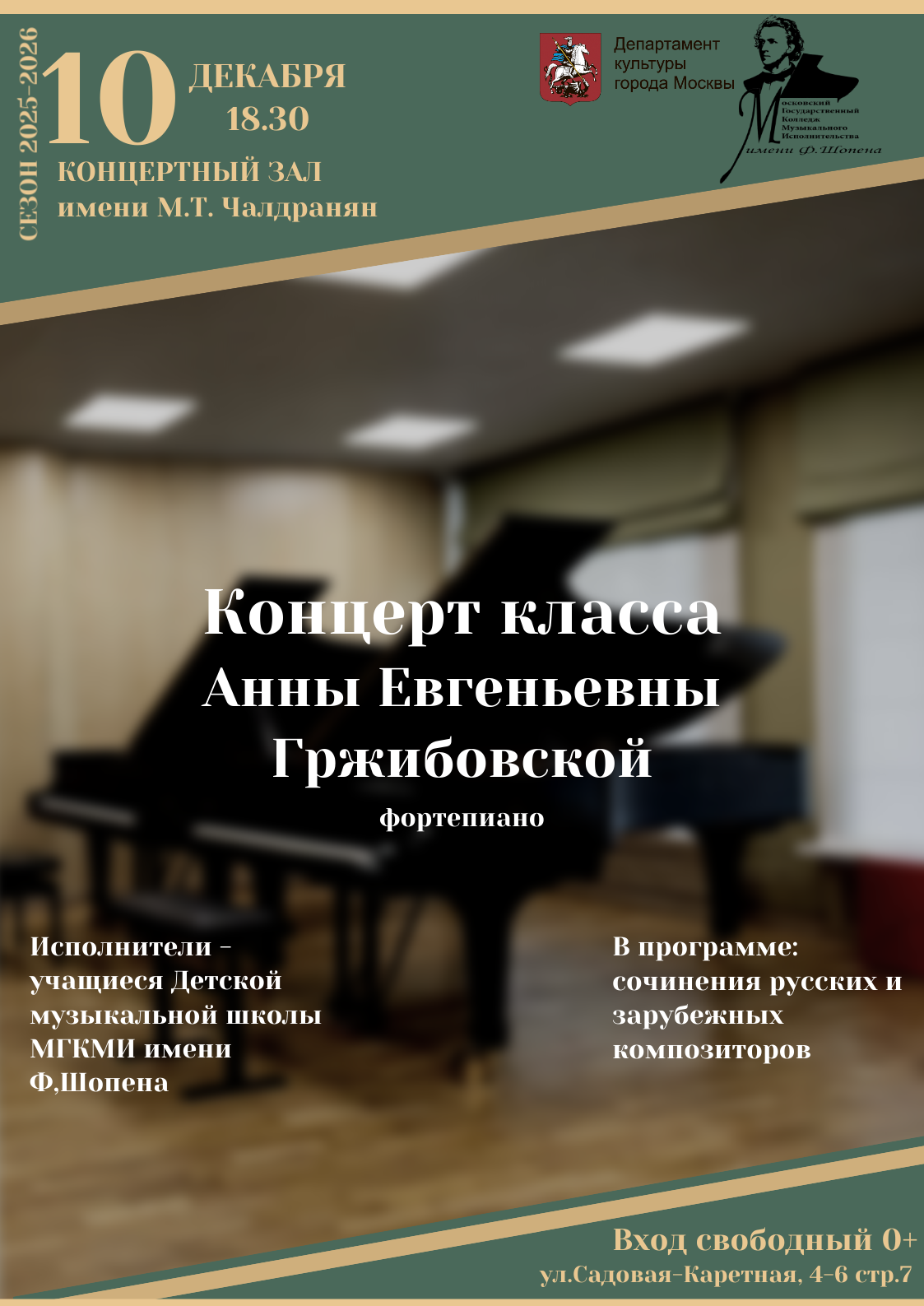 | 10.12 (среда) 18.30 | Классный вечер преподавателя по классу фортепиано А.Е. Гржибовской Классный концерт Концертный зал им. М.Т. Чалдранян