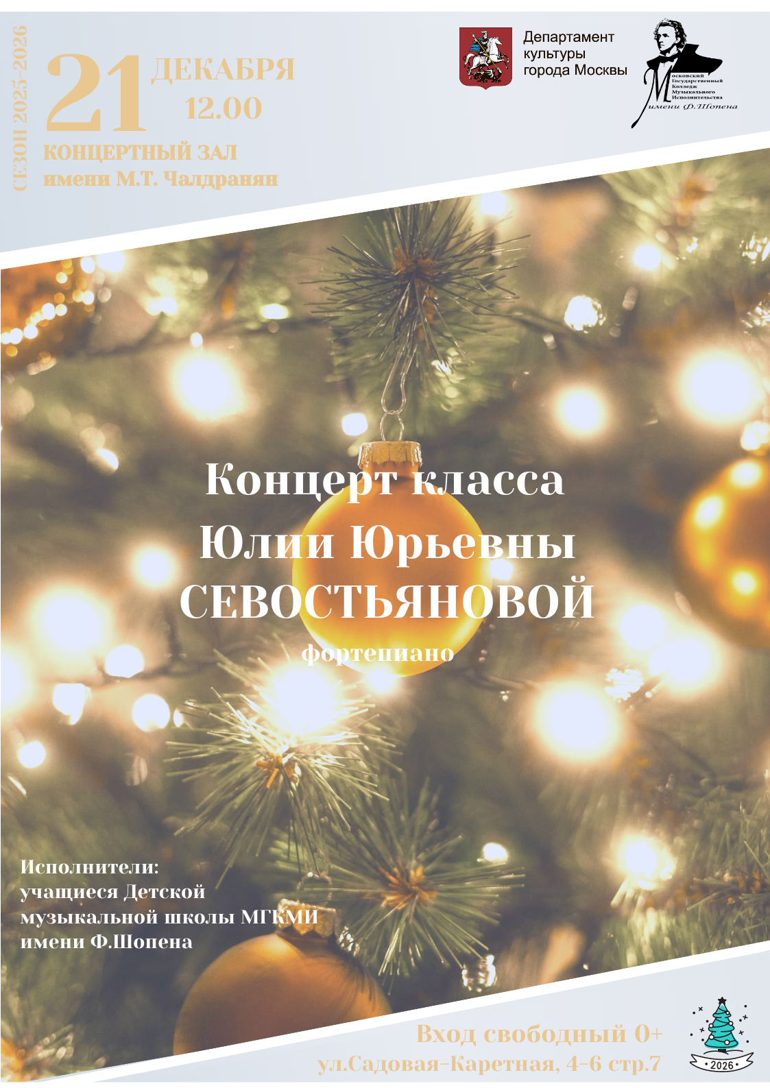 21.12 (воскресенье) 12.00 | Классный концерт преподавателя по классу фортепиано Ю.Ю. Севостьяновой Классный концерт Концертный зал им. М.Т. Чалдранян