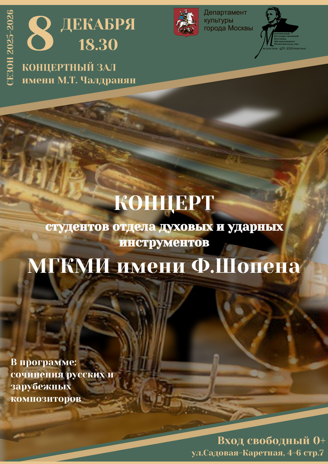 08.12 (понедельник) 18.30 | Концерт студентов отдела оркестровых духовых инструментов Концерт студентов МГКМИ им.Ф.Шопена Концертный зал им. М.Т. Чалдранян