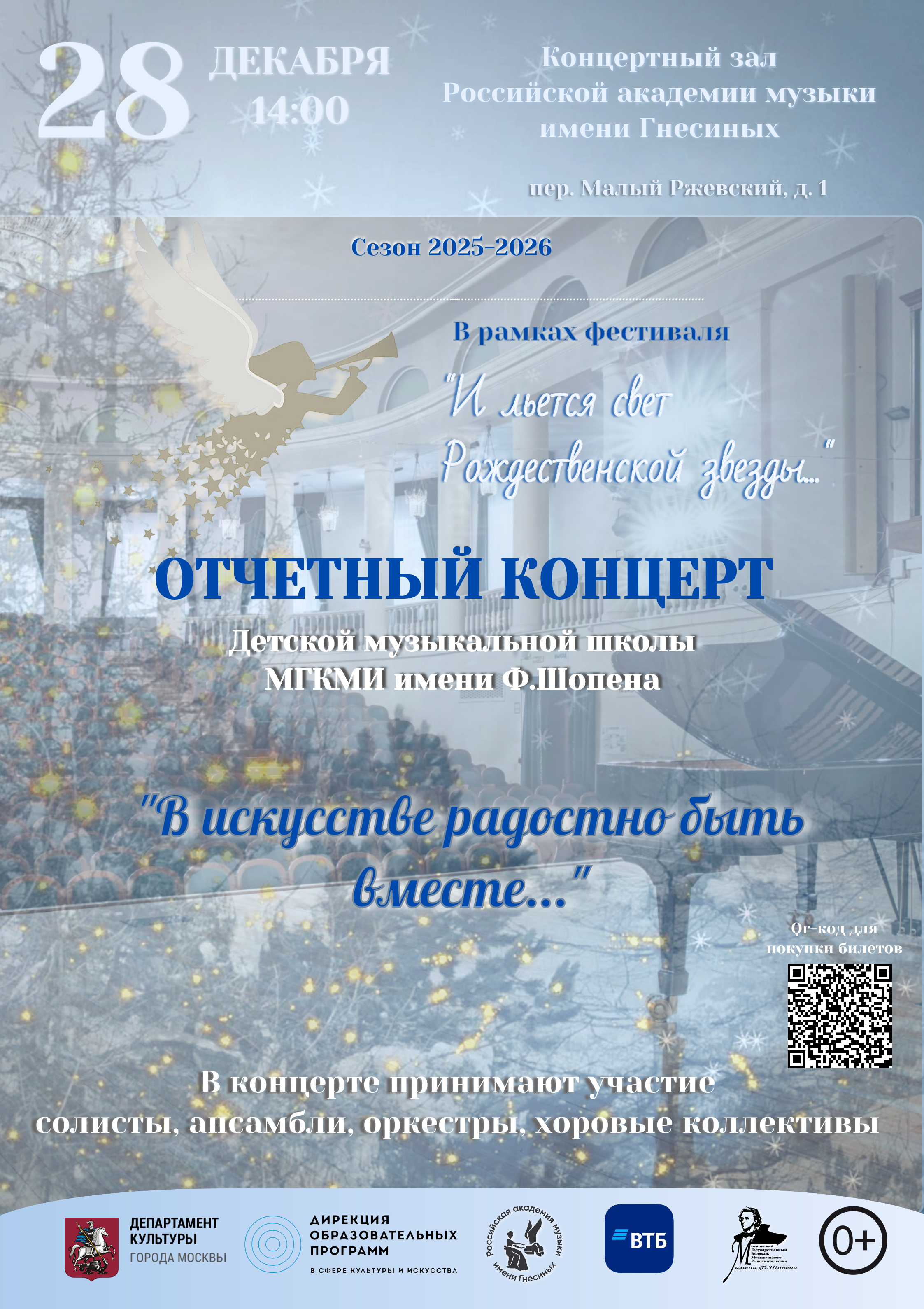 28.12 (воскресенье) 14.00 | Отчетный концерт ДМШ "И льется свет Рождественской звезды" Отчетный концерт ДМШ Концертный зал РАМ им. Гнесиных |